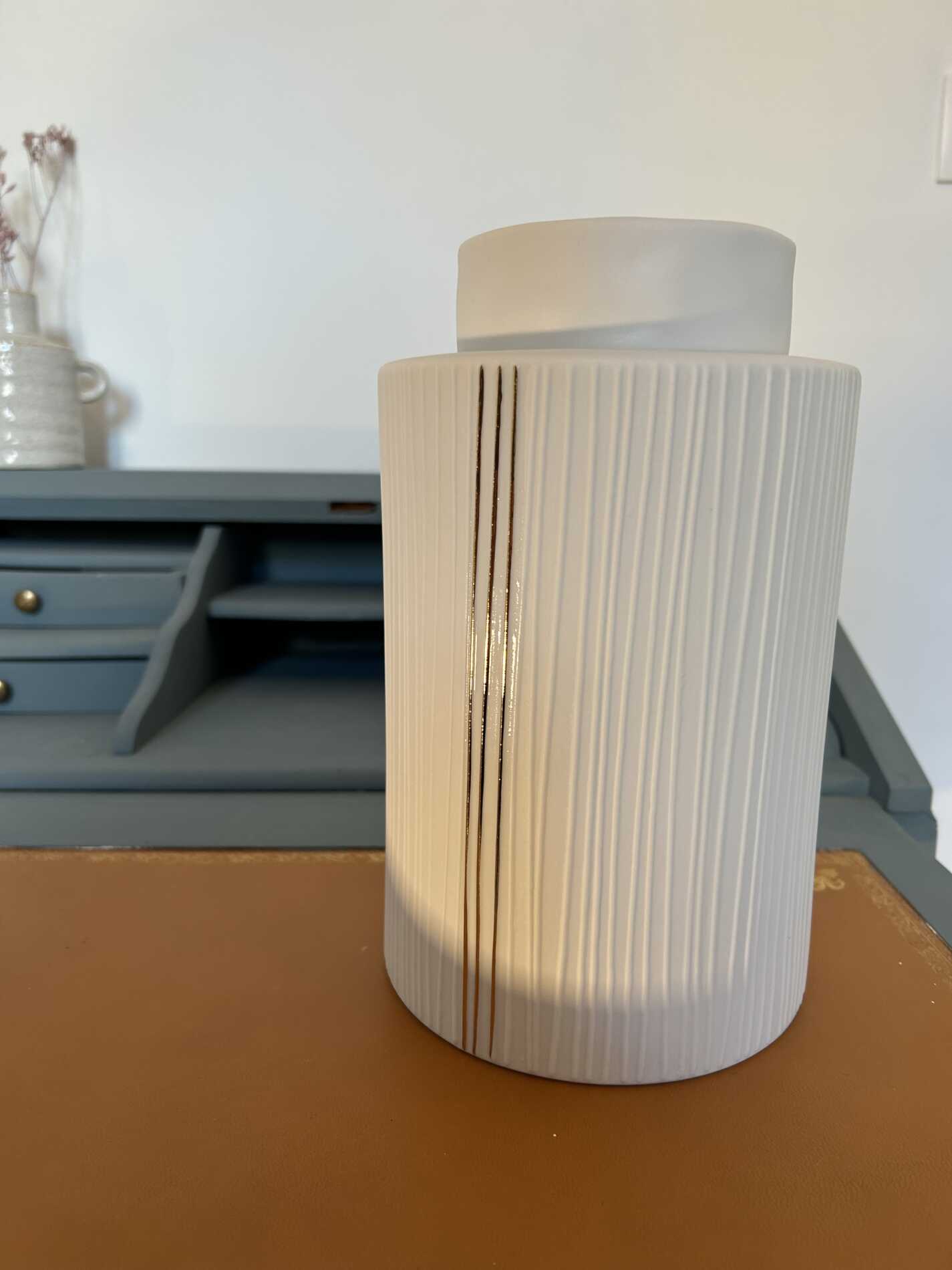 Ce gros pot en porcelaine blanche signé Rader séduit par son design épuré et raffiné. Sublimé par trois délicates rayures dorées, il apporte une touche chic et lumineuse à tous les intérieurs.