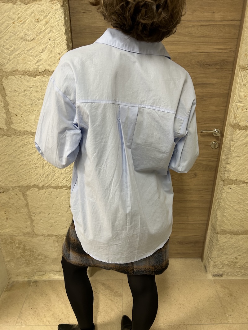 Douceur, raffinement et féminité s’invitent dans votre dressing avec cette chemise bleue brodée Mon Amour. Une pièce intemporelle, twistée par des détails romantiques à l’encolure . À porter aussi bien pour une journée pro que pour un dîner chic, elle allie sobriété et caractère.
