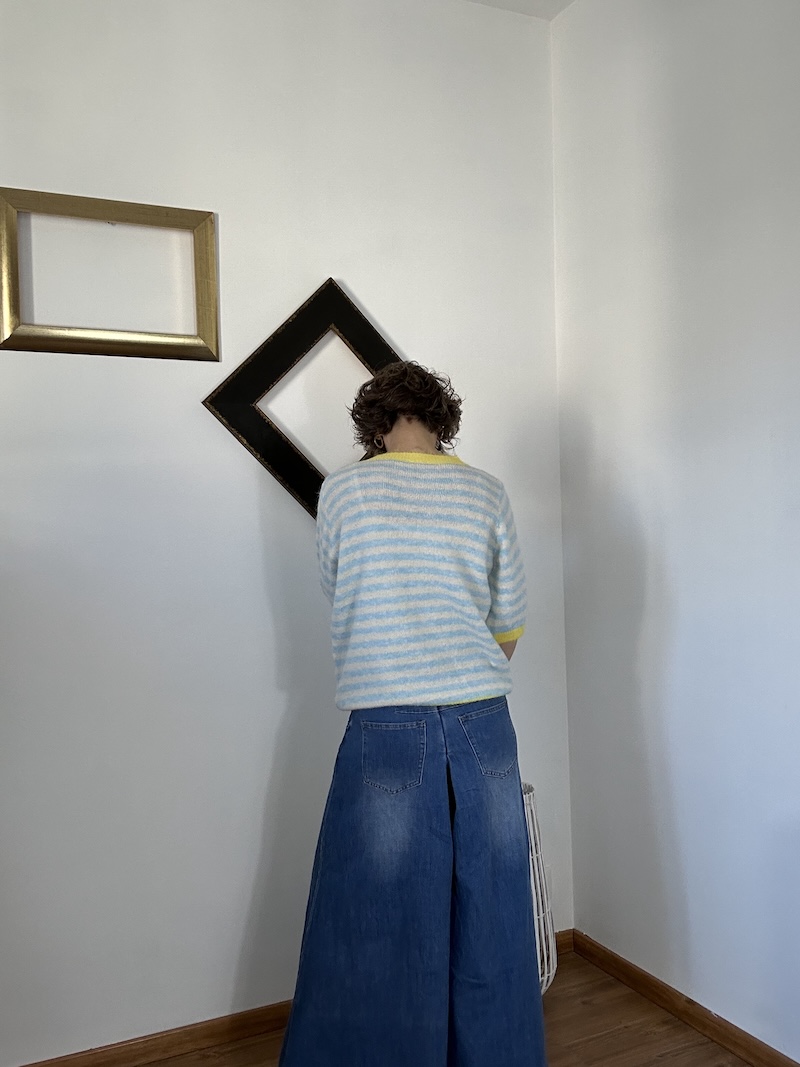 Un pantalon en jean à l’effet jupe-culotte, à la coupe large et moderne.