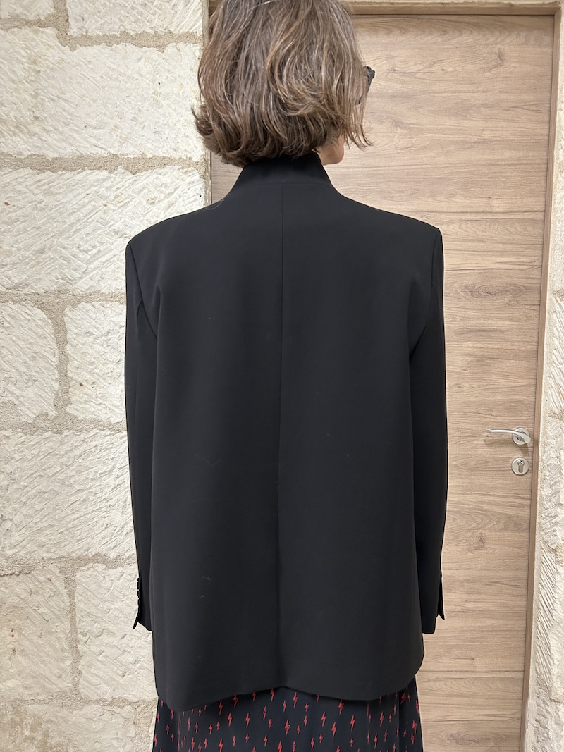 Confectionnée dans une matière de belle tenue, cette veste noire structure la silhouette sans la rigidifier. Elle se porte aussi bien fermée pour un look chic et affirmé, qu’ouverte pour une allure plus décontractée.